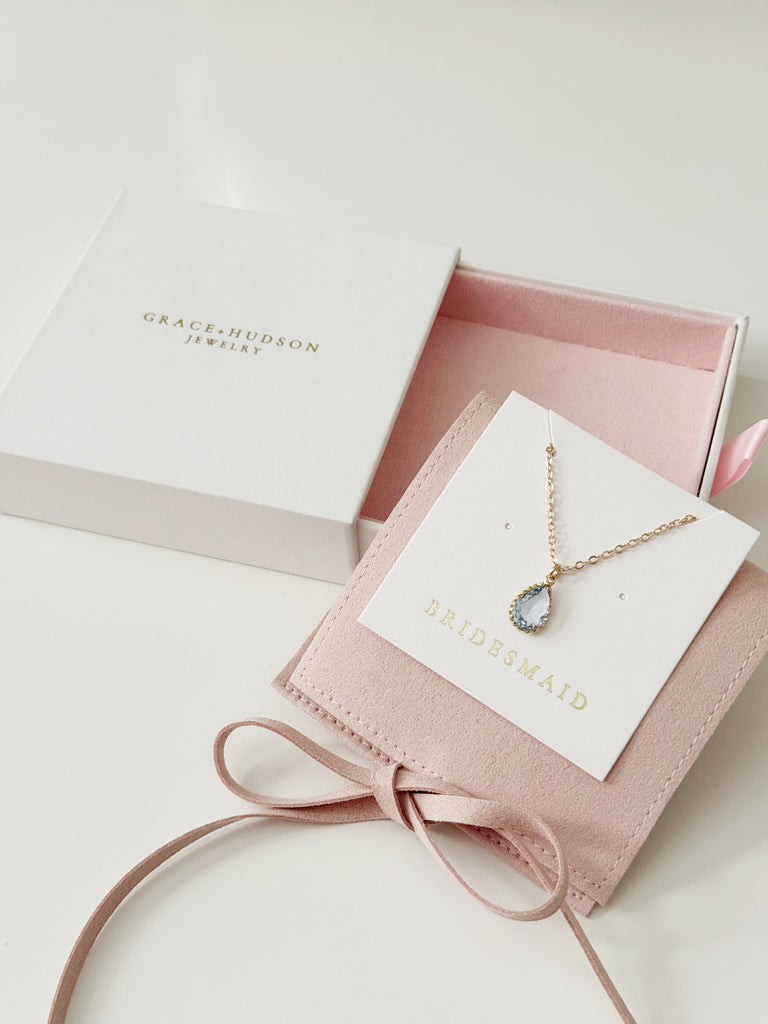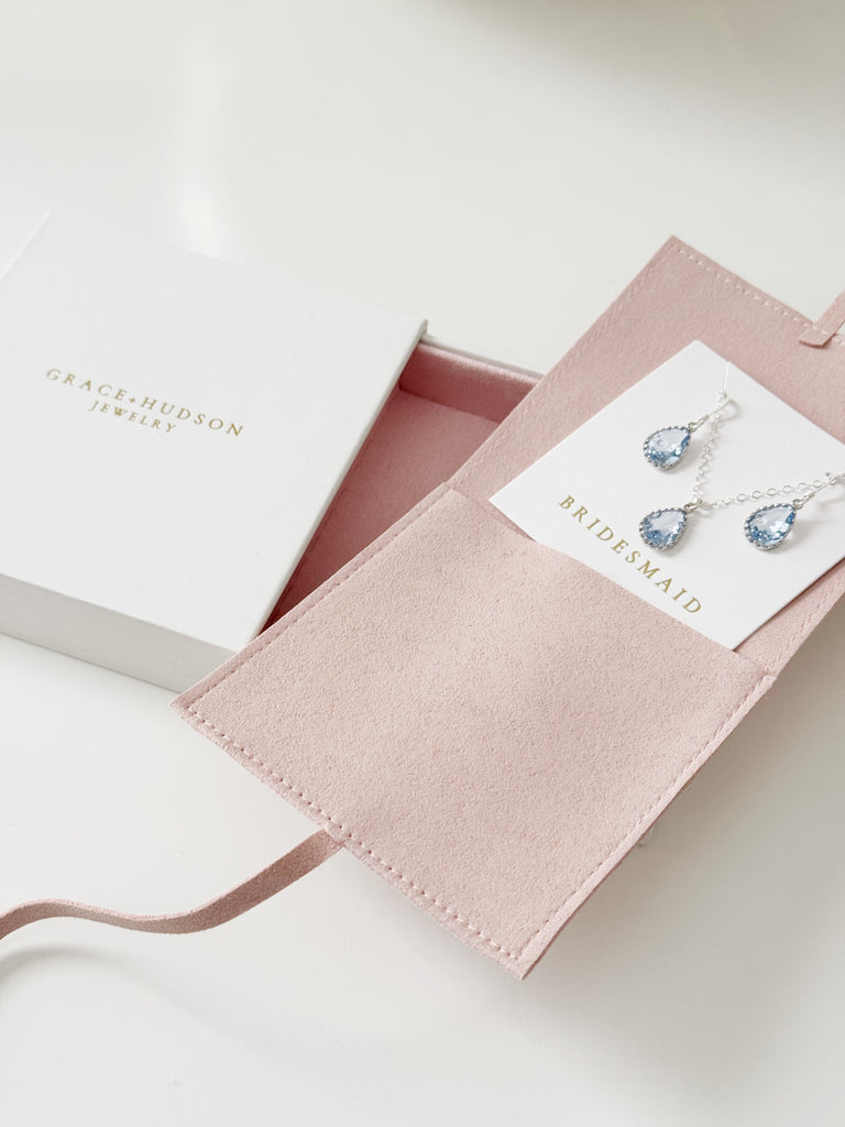 After debating for a few weeks about whether or not to give my bridesmaids a thank you gift vs. a card only for our wedding...I decided about 5 days before our wedding to go for the gift and card option. While I don't recommend everyone make a rush order, Grace and Hudson really came through with these earring and necklace sets on short notice. They were beautiful and thoughtfully packaged, and were even delivered in time for our wedding rehearsal (with rush shipping). Customer service got in touch to ensure all details were in order before shipping. All of our bridesmaids loved their sets, and most chose to wear their sets at the wedding.